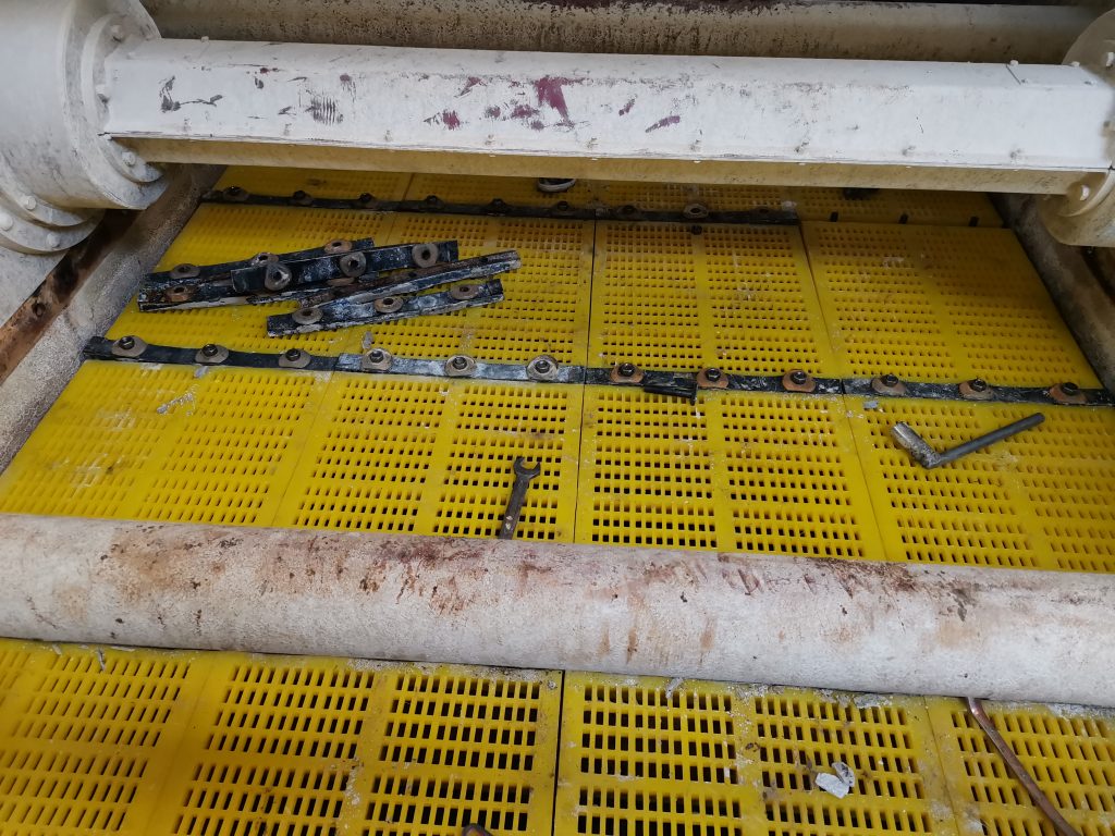 ? ? 2019年12月,南昌鑫力技術人員走訪宜春鉭鈮礦時,了解到現(xiàn)場使用的一臺2460直線篩具有篩網(wǎng)堵孔、使用壽命低等影響篩分效率的問題,這個問題困擾了宜春鉭鈮礦的工作人員近十年,為解決篩網(wǎng)問題,他們先后使用過金屬沖孔篩網(wǎng)、不銹鋼條縫篩網(wǎng)、TDI聚氨酯篩網(wǎng),但都是“治標不治本”。